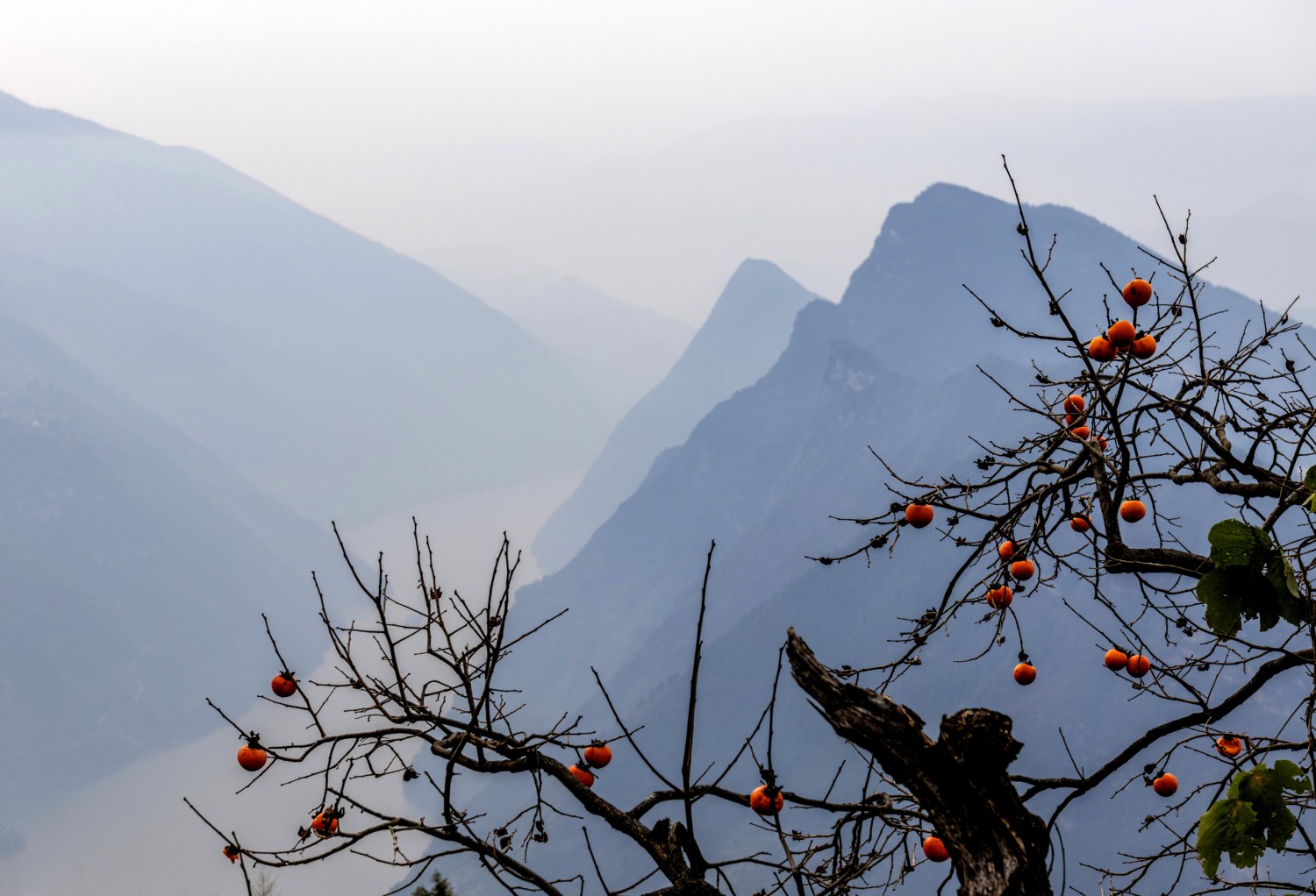作品说明:在巫峡口,山峦在薄雾中若隐若现,如诗如画。枝头上的柿子像红灯笼,寓意着吉祥如意。“巳巳如意生生不息”,仿佛是这片山水的祝福。巫峡口见证了岁月变迁,江水奔腾不息,如同生命的力量在延续,这里的美景和寓意都令人心醉。