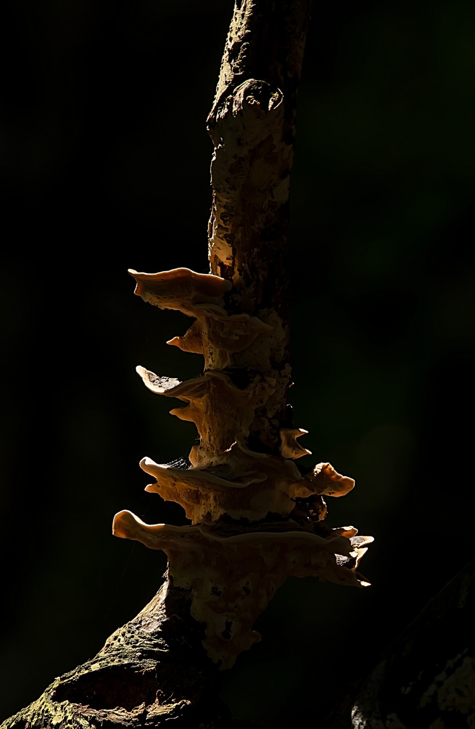 作品说明:树干上一层一层向上生长的野生蘑菇,在朝阳的照耀下彷如一尊佛塔,佛光灵耀。