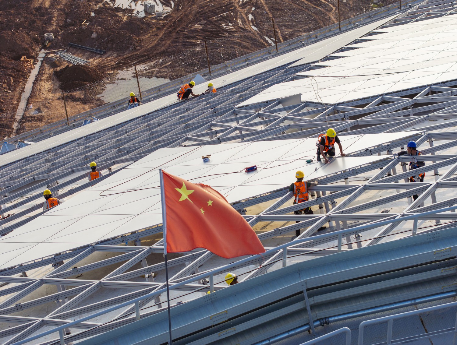 作品说明: 2025年9月15日,建设中的四川省广安市广安奥体中心,工人在国旗下进行幕墙安装施工。