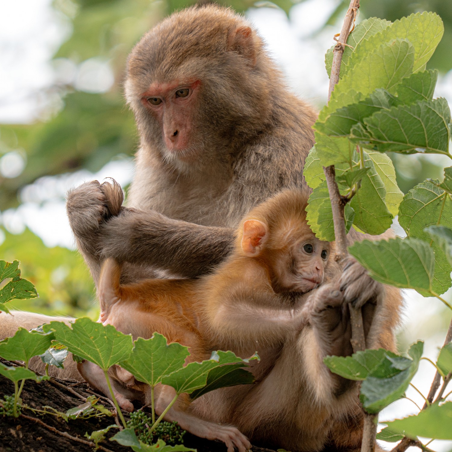 作品说明:在葱郁枝叶织就的天然襁褓中,一只成年猕猴与幼崽紧紧依偎。幼猴蜷缩于母猴怀间,粉嫩爪尖轻攥枝桠,懵懂眼眸映着林间漏下的光斑;母猴低垂眼睑,目光温柔如溪,梳理着幼猴尾尖的毛发。周身暖绒在绿意中泛着柔光,似要将整座森林的安全感都裹进臂弯。