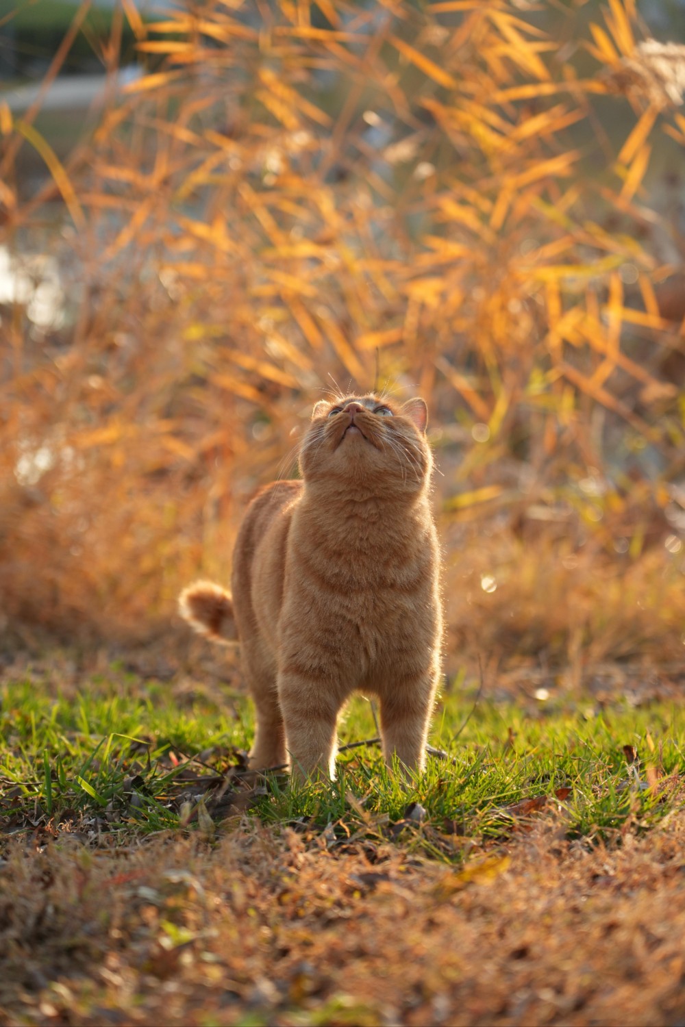 作品说明:拍摄于去年北京一个秋天的湖边。 青草发黄,叶子在阳光的照耀下闪闪发光,小猫看着天空,似乎也感受到了天气的变化,下次出来要穿厚点了。