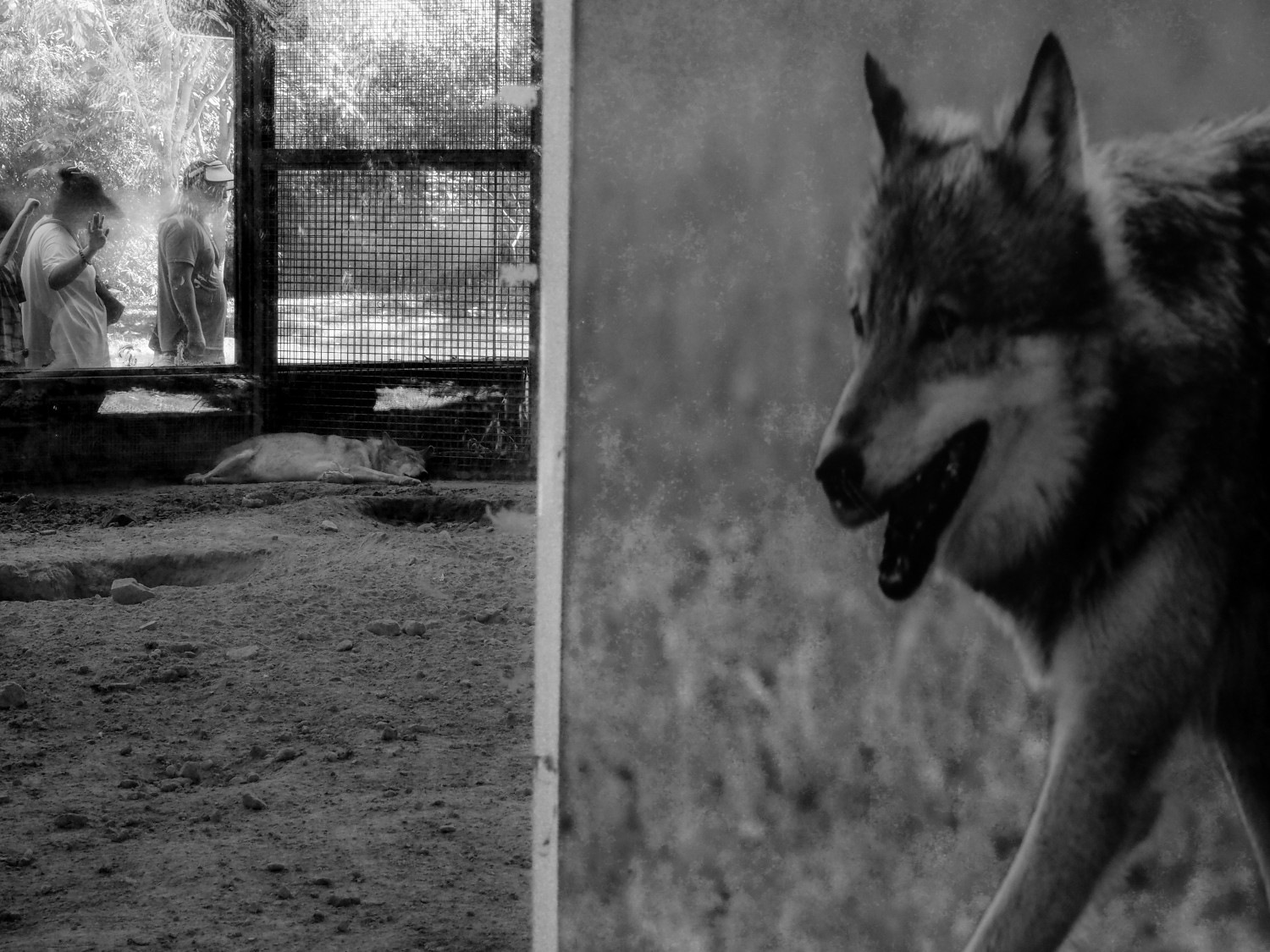 作品说明:正如卡夫卡在《变形记》中对异化境遇的叩问,画面里的狼也困于现代文明的“囚笼”——左侧铁网与右侧玻璃,既是物理的阻隔,更是野性与人类围观欲的边界。笼内一狼酣睡、一狼徘徊,恰似波德莱尔笔下“都市的忧郁”,在被规训的空间里,野性的余烬或沉眠、或挣扎。而笼外的观客,是文明社会的窥视者,他们与狼的对望,恍若《动物园的哲学》中对“被观看的他者”的隐喻,暴露着人类在征服自然后,又对野性残存的复杂情愫。 这囚笼是玻璃与铁网的实体,也是文学中反复出现的异化牢笼,它困住了狼的奔跑,也困住了人类对野性本真的理解,在黑白的光影里,吟唱出一曲关于自由与禁锢的永恒咏叹。