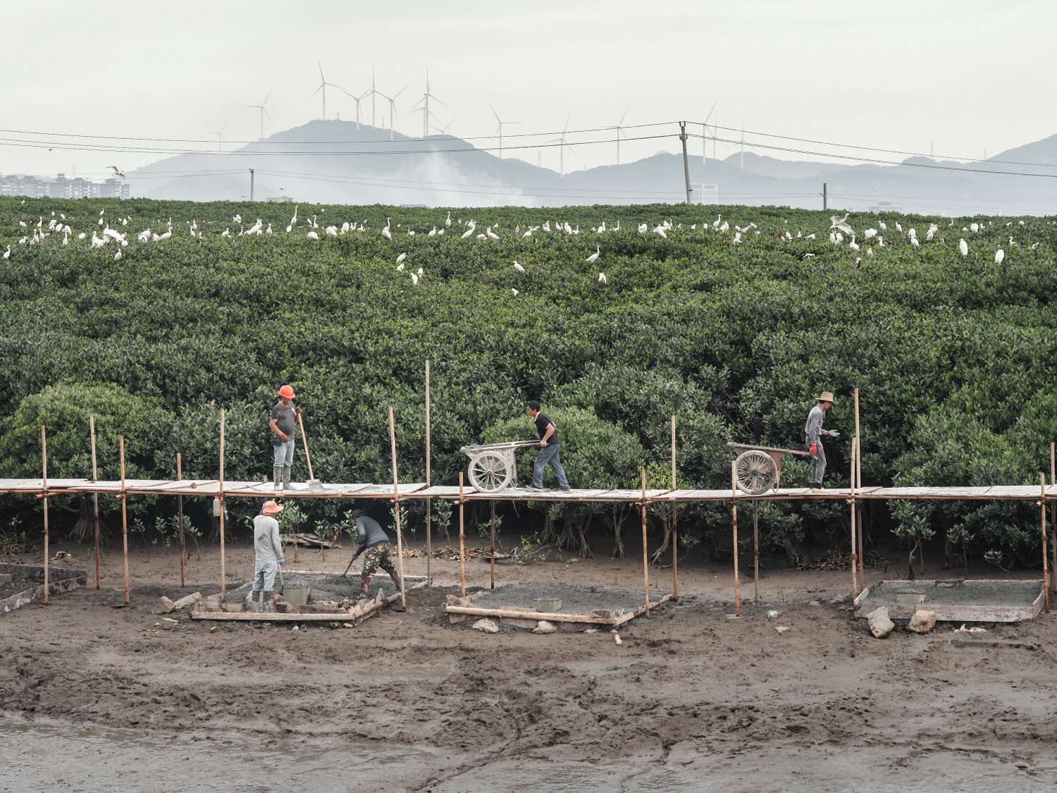 作品说明:泥泞的滩涂上,脚手架林立,工人劳作的身影与身后茂密的红树林形成鲜明对比,而远方山丘上的风力发电机与白鹭群栖的景象交织出一幅复杂的生态图景。这不仅是人类文明与生态环境的对话,更是关于“入侵”与“共生”的双面叙事。之所以叫问鹭,是因为白鹭作为这片土地原生的沉默见证者,人类的一切行为,最终都需要接受自然的审视与拷问。