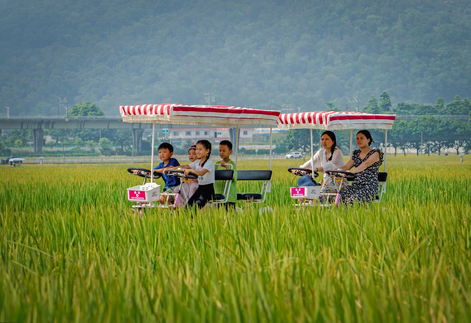 作品说明:2024年10月19日,游客在广东省中山市崖口村稻田的小路上骑车。