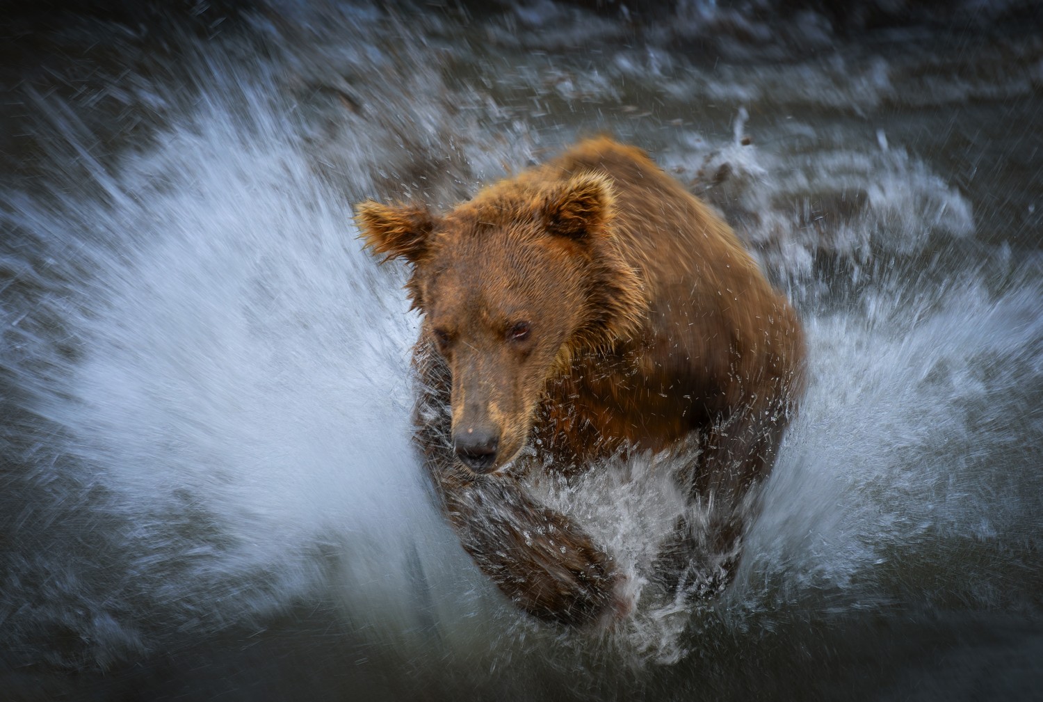 作品说明:2025年8月份拍摄于勘察加库页湖,一头棕熊在湖中捕食鲑鱼,慢门拍摄