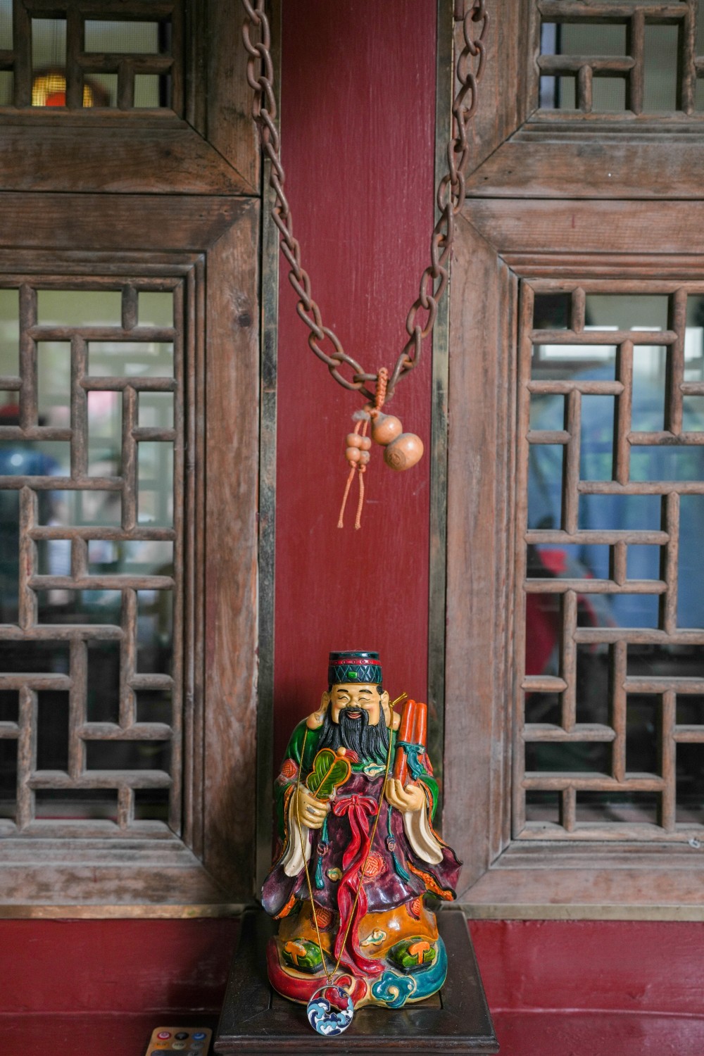 作品说明:中式古旧木格门窗前,供奉着色彩艳丽的神祇造像,造像神态安和、衣饰华美;上方铁链悬着葫芦挂件,红柱与木窗相映,满溢民俗文化中对福瑞的祈愿与传统意韵。