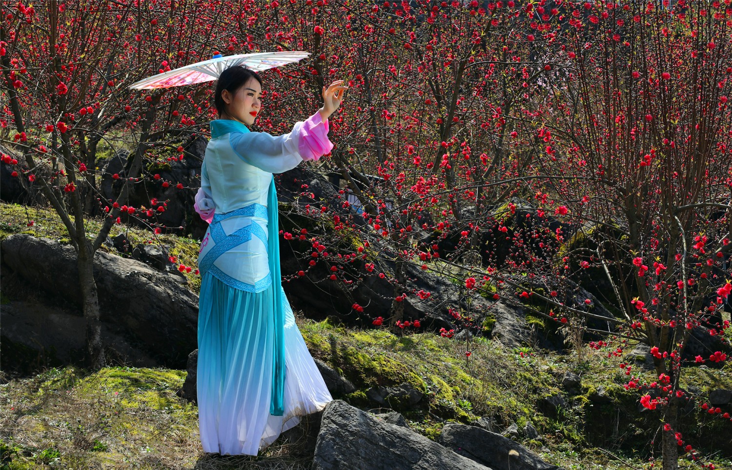 作品说明:湖南武冈市晏田乡扶塘村的百亩桃林中,一名少女身着汉服古装正乘满园春色之风拍照留影。