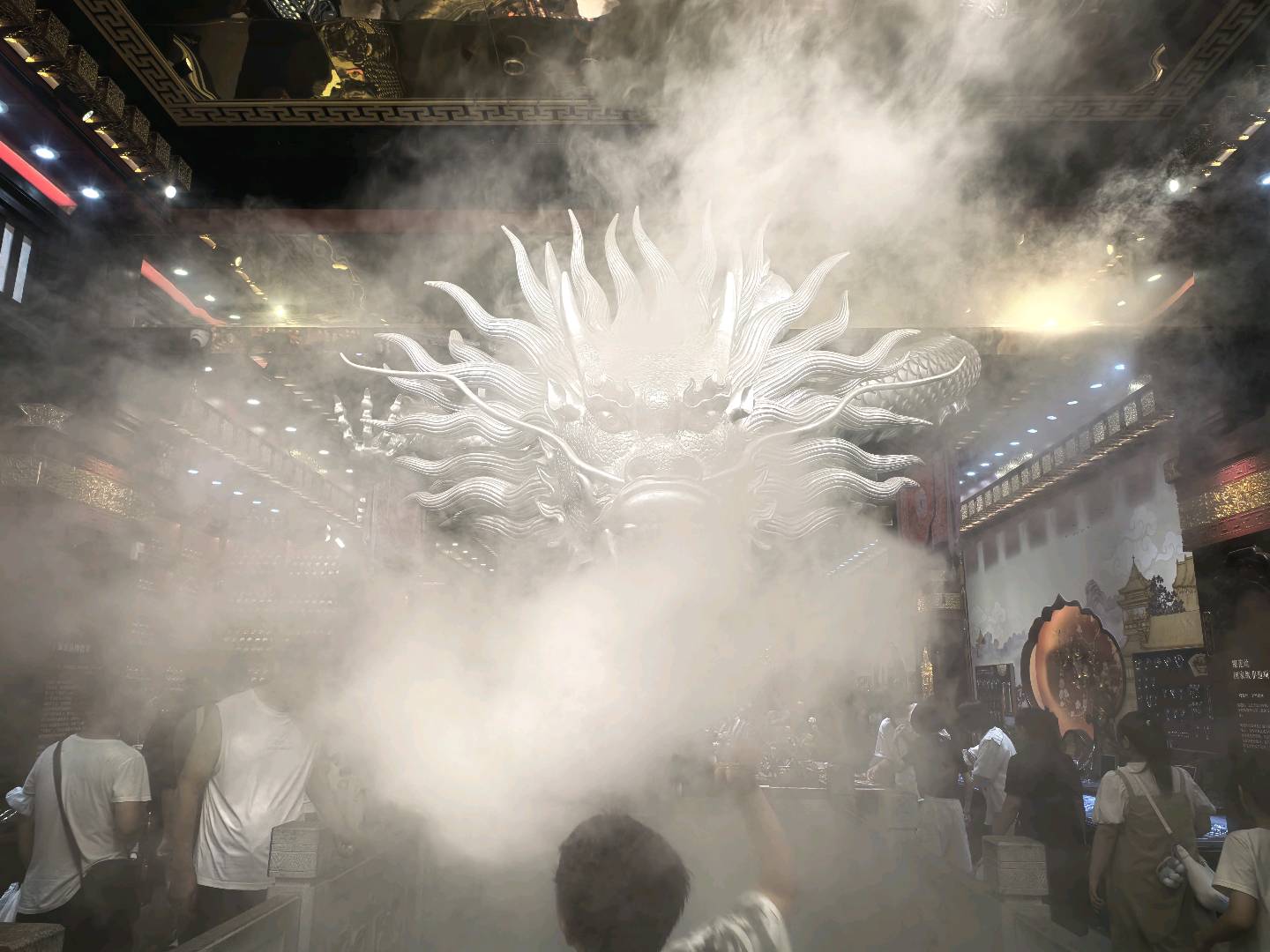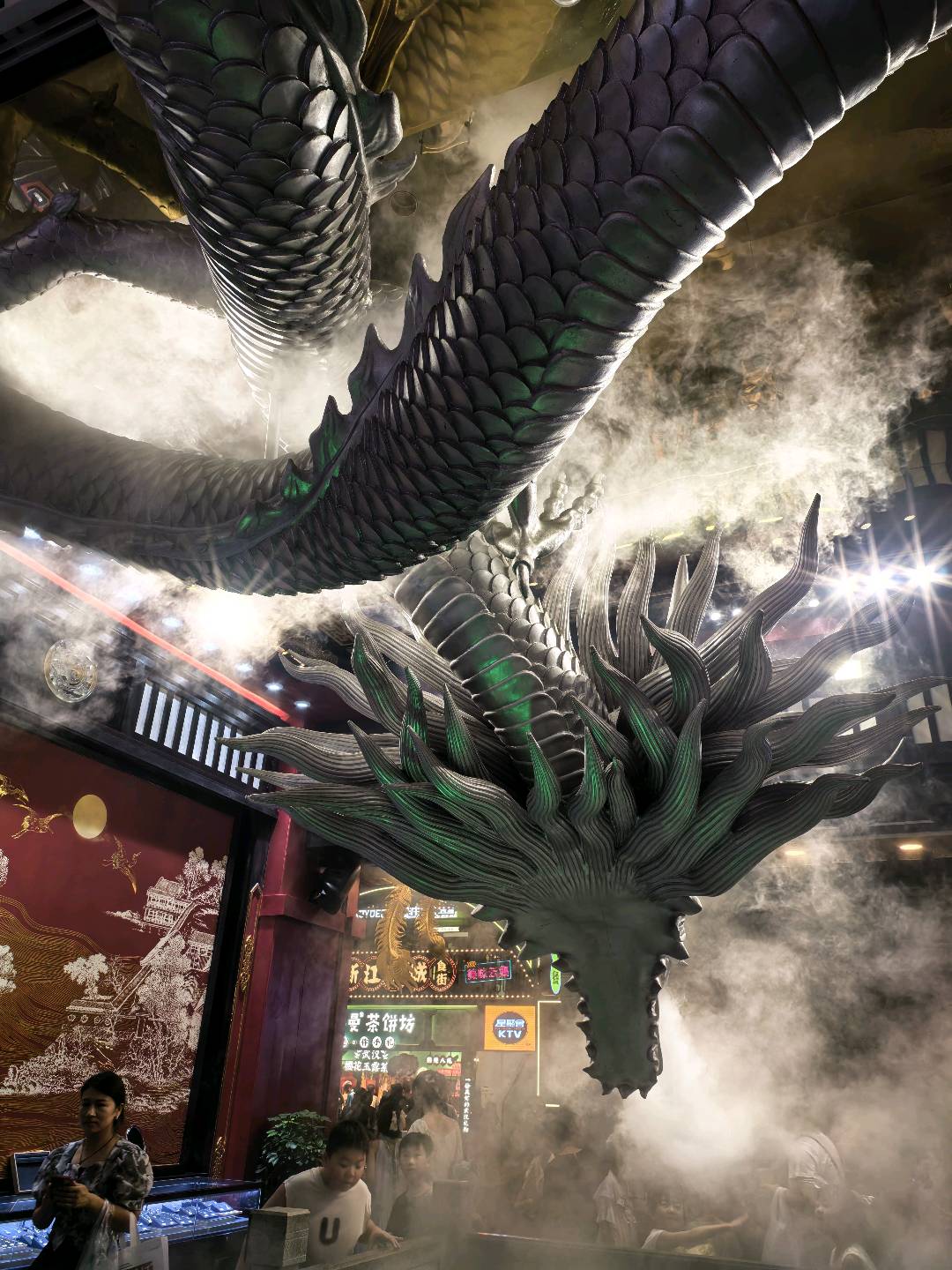 作品说明:从银龙昂首的威严到青龙盘踞的灵动,云雾始终是这场视觉盛宴的注脚。当古老图腾遇见人间烟火,冰冷的雕塑便有了呼吸——龙首在雾中若隐若现,鳞甲折射着现代灯光,游人的惊叹与神兽的沉默在穹顶下共鸣,最终凝成一曲关于传承与震撼的无声史诗。
