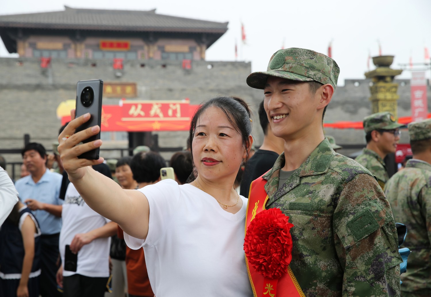 作品说明:2025年9月14日,山东省临沂市郯城县一名入伍新兵与家长拍照留念。