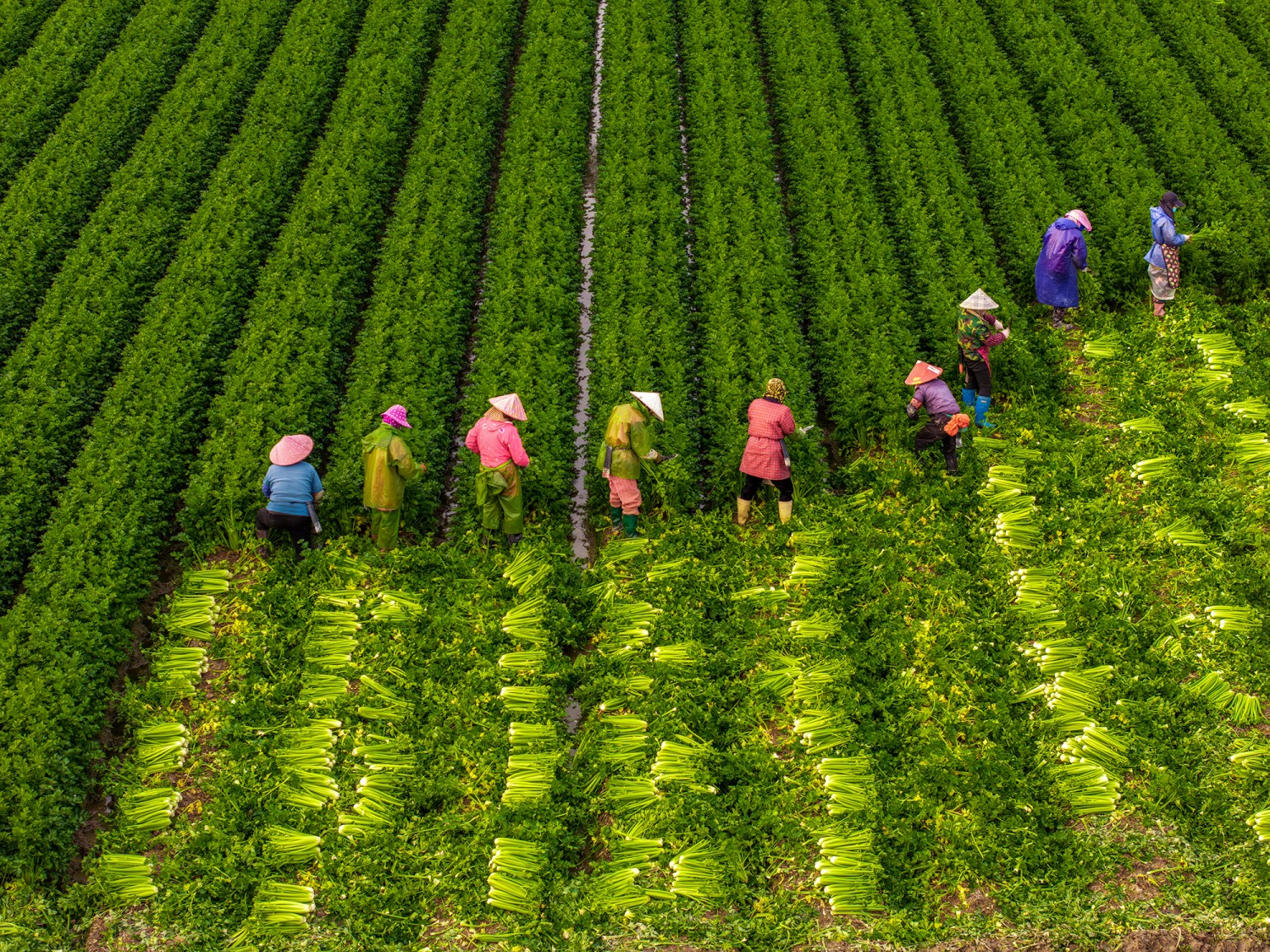作品说明:田野被规整的田垄划分成块块绿格,芹菜在垄间蓬勃生长,翠绿的茎叶带着清新水汽。农人们戴着各式帽子,分散在菜田里,动作娴熟地弯腰、收割、整理。他们的身影在这片绿意中,是最质朴的存在。没有轰轰烈烈的场景,只是日复一日重复着收割的动作,将土地孕育的芹菜,一把把、一筐筐收获,这些平凡的劳作,最终化作餐桌上的新鲜滋味,维系着烟火人间最本真的日常。