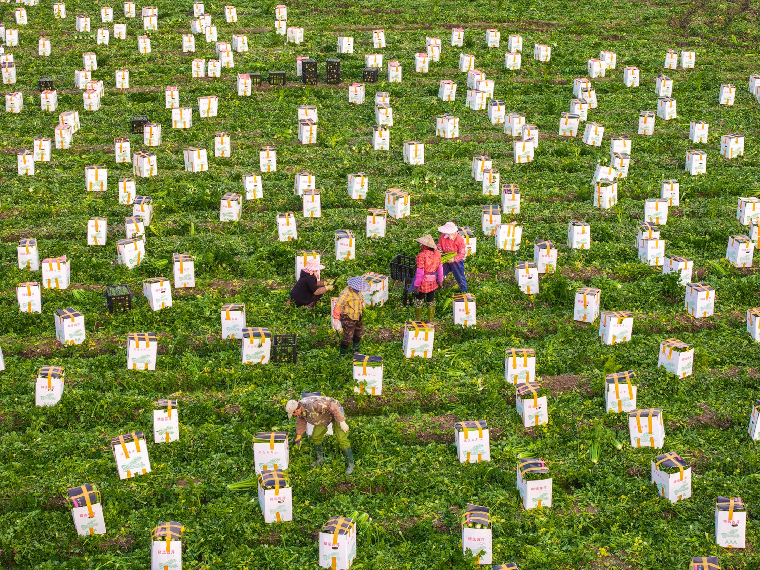 作品说明:装满西芹的白色箱子在阳光下熠熠生辉,宛如点点繁星散落人间。工人们身着彩色的工作服,在这片白色的海洋中穿梭忙碌,他们正有序地将一箱箱冬芹装车,准备送往下一站,非常壮观的丰收场景。