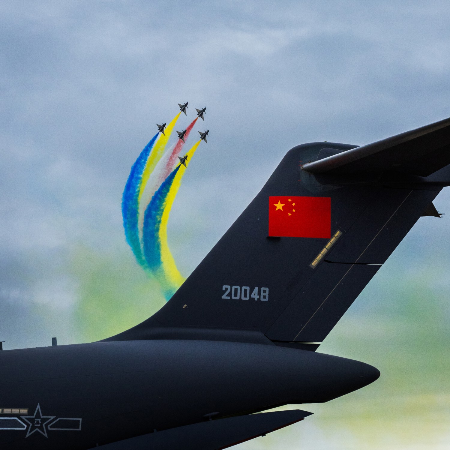 作品说明:珠海航展上,运20羽翼出现的特技表演展现我大国实力!
