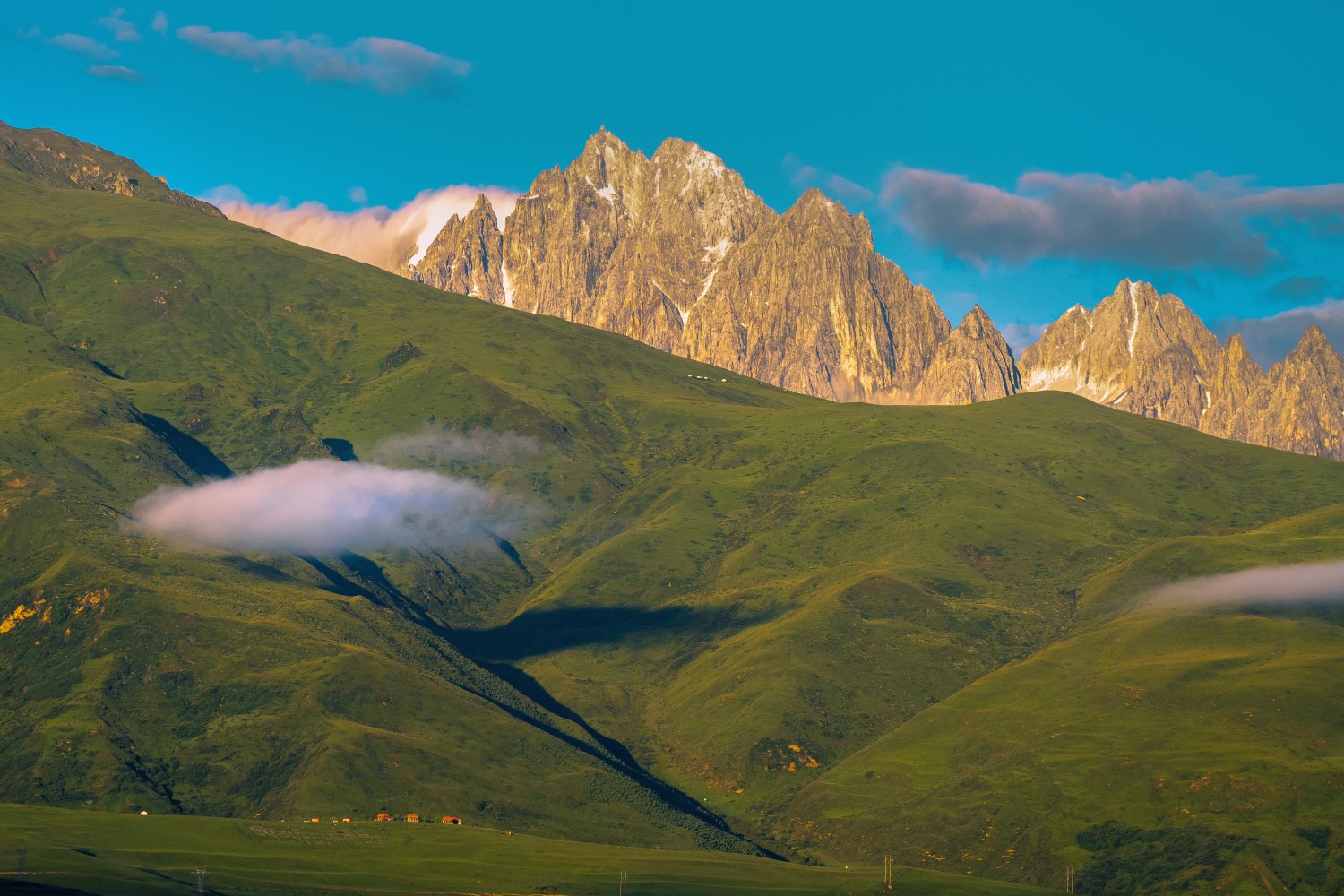 作品说明:四川甘孜登上高山远眺,远山绿地红房,给人一种宁静之美