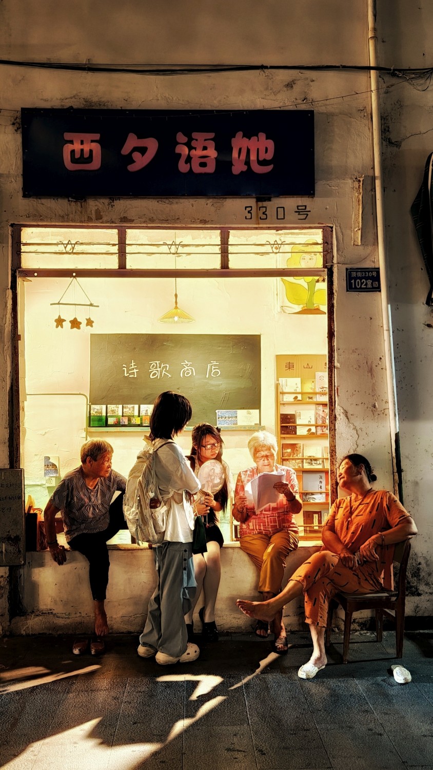 作品说明:古村街巷暖暖的灯光下,一位老奶奶正用家乡话给小女孩念着她的手稿。