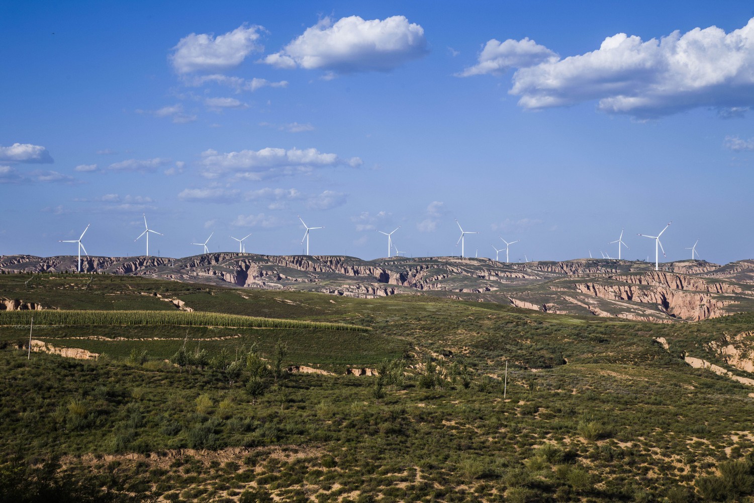 作品说明:展现蓝天、白云下,风电设施与起伏山峦、葱郁植被相融的画面,尽显自然与科技共生的和谐之美。