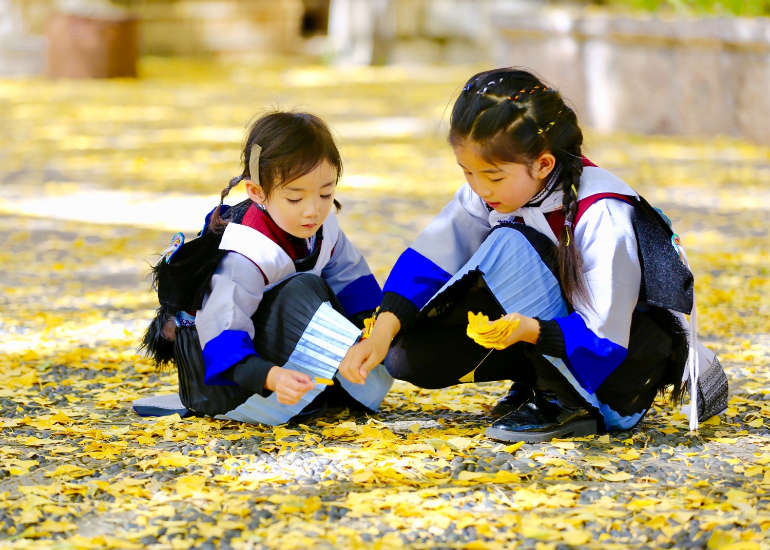 作品说明:银杏树下的俩姐妹快乐的数着金黄的银杏叶,你一张我一张。
