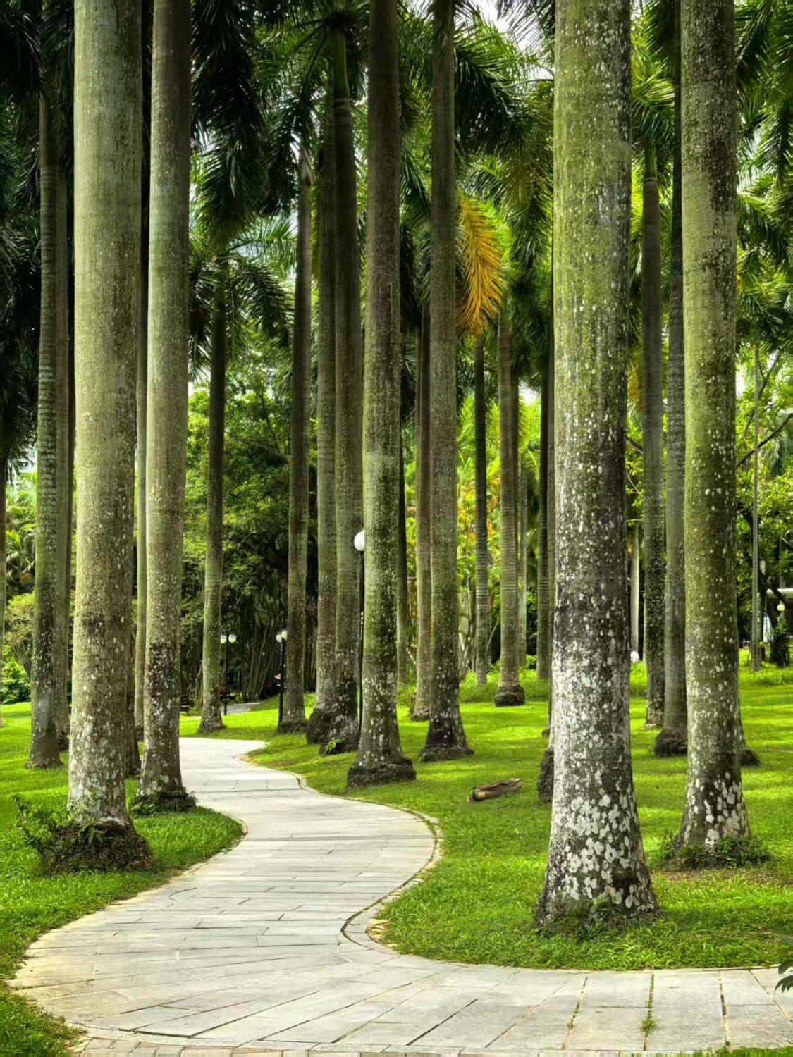 作品说明:画面中,笔直的棕榈树整齐排列,仿佛忠诚的卫士,守护着中间的小路。它们高大而挺拔,树干笔直向上,树冠如巨大的绿伞,为小路撑起一片阴凉。小路蜿蜒其中,仿佛一条绿色的丝带,引领着观者的视线向远方延伸,给人一种通向未知的探索欲望。阳光透过棕榈树的枝叶洒下,形成斑驳的光影,为整个画面增添了一份灵动与诗意,让人感受到大自然的宁静与美好。