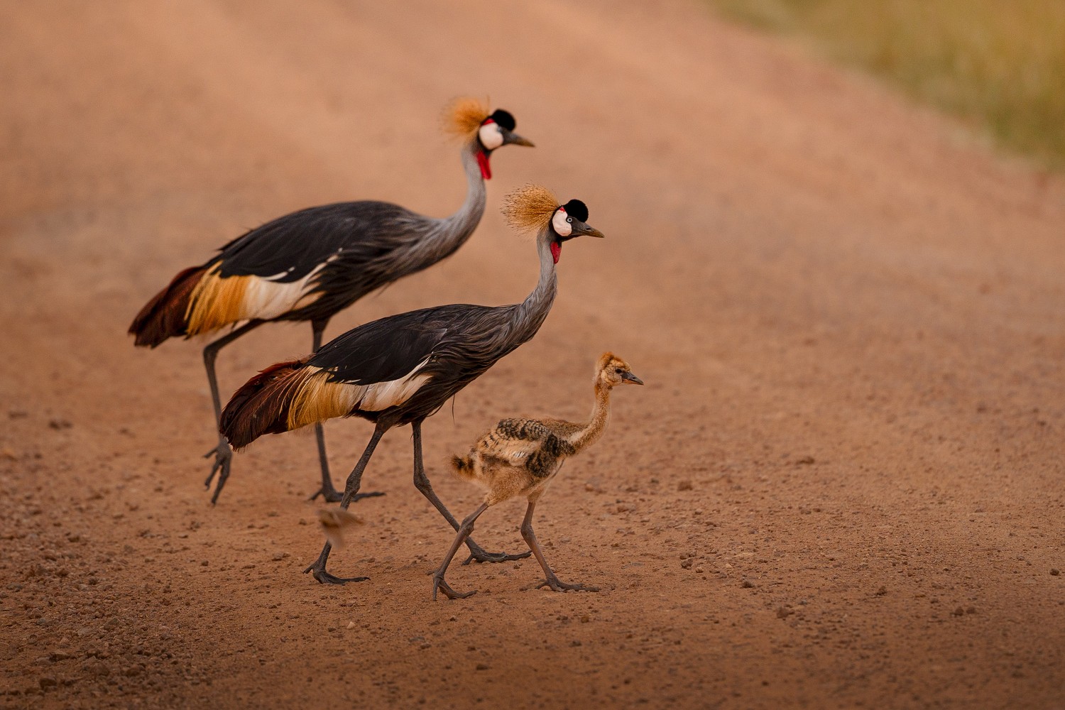 作品说明:2024年02月28日拍摄于肯尼亚安博塞利国家公园,冕冠鹤一家三口一起外出觅食