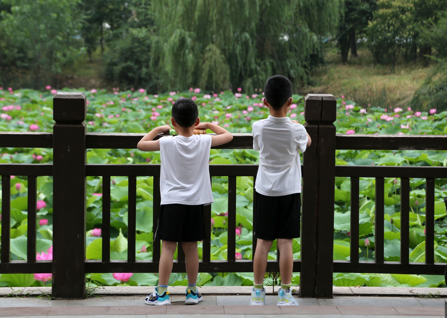 作品说明:2025年6月21日,两个小朋友在山东省临沂市郯城县墨泉“口袋公园”赏荷。