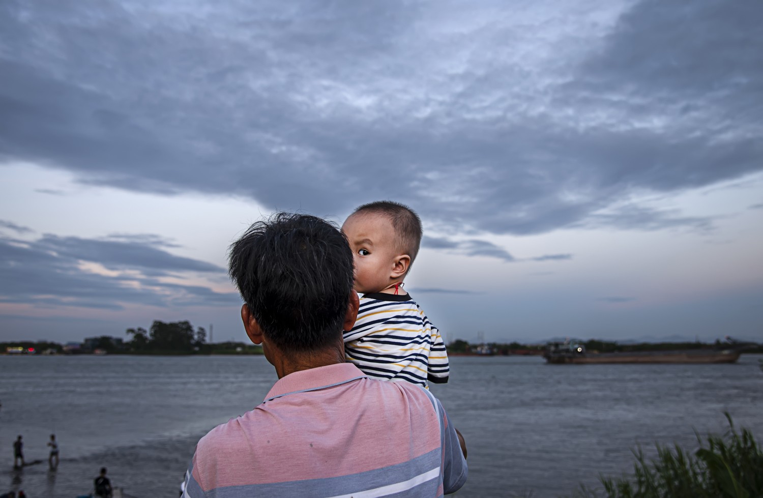 作品说明:夏日黄昏,江边父子在看风景,小孩回头一望的瞬间。那个小男孩的眼睛里闪烁着好奇和天真,他对这个世界充满了好奇和探索的欲望。