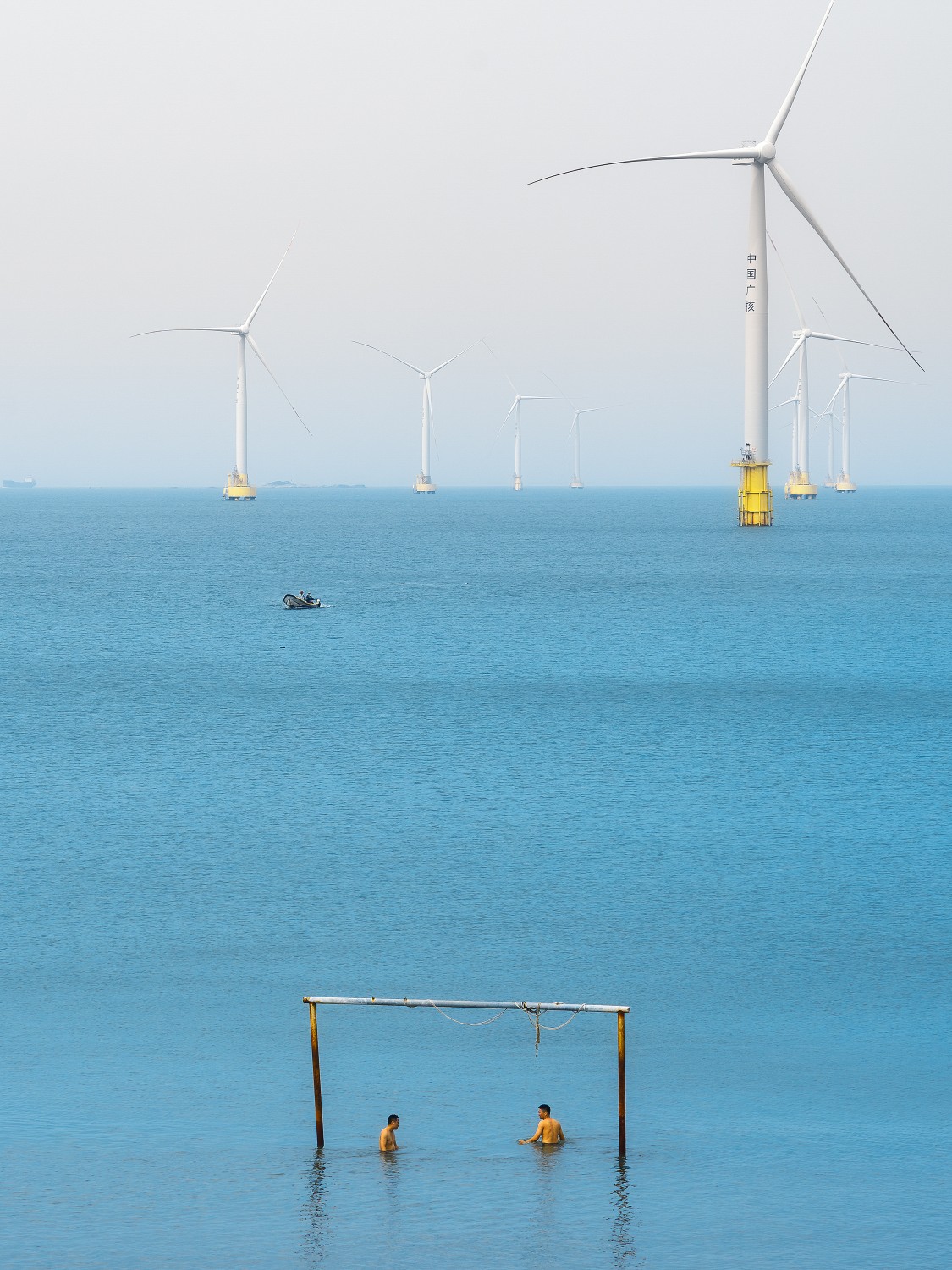 作品说明:如镜的海面,托着巨型风车悠悠转动,似在与风进行一场无声的对话。小船划破蓝绸般的水面,留下细碎波纹。水边的人,浸在清凉海水中,没有惊天动地的故事,只是在寻常日子里,与这海、这风、这工业与自然交融的景致相伴,平凡的时光,也因这方天地,变得格外有滋味。