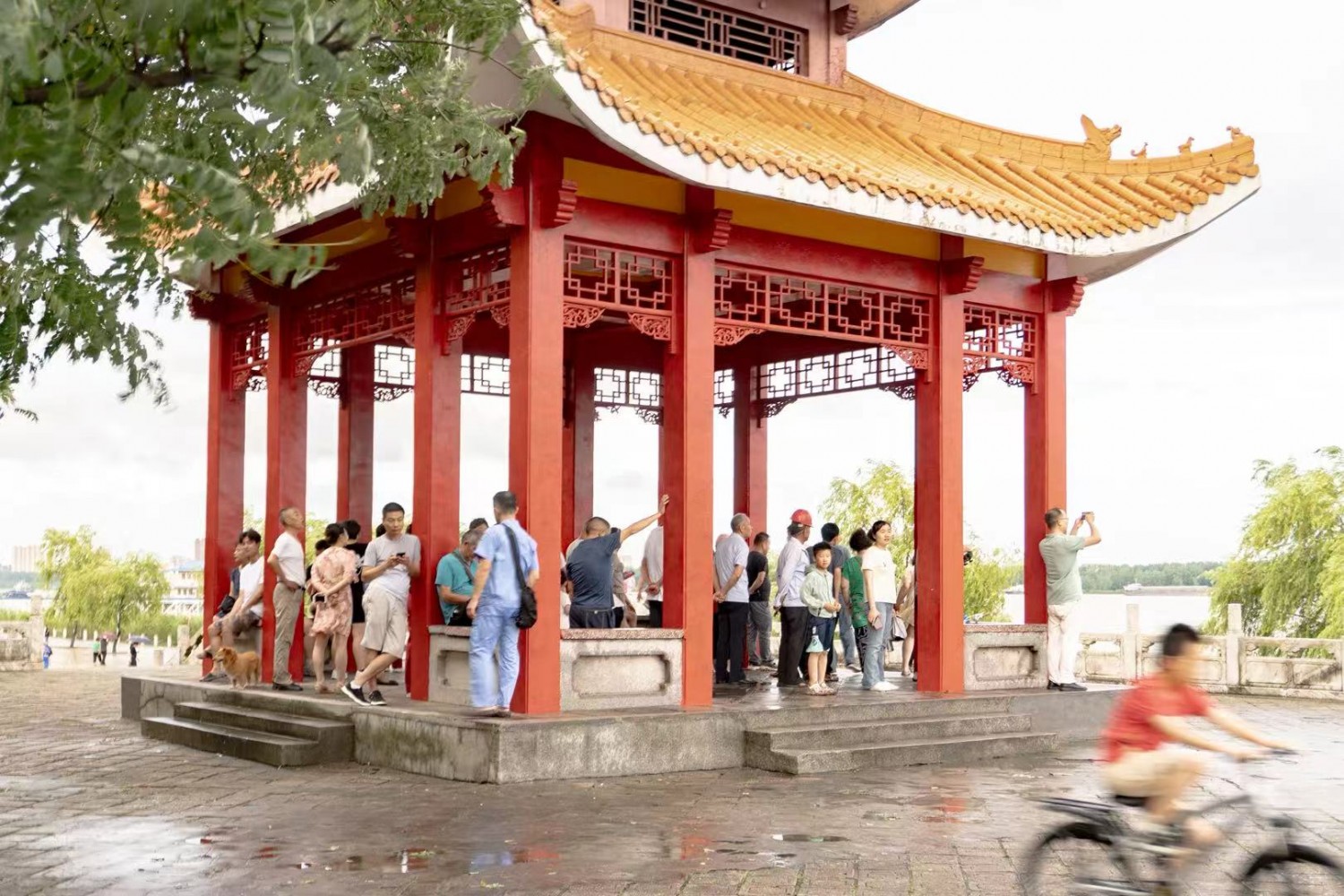 作品说明:下雨天,人们聚集在亭子里躲雨,调皮的孩子骑车,不怕下雨。